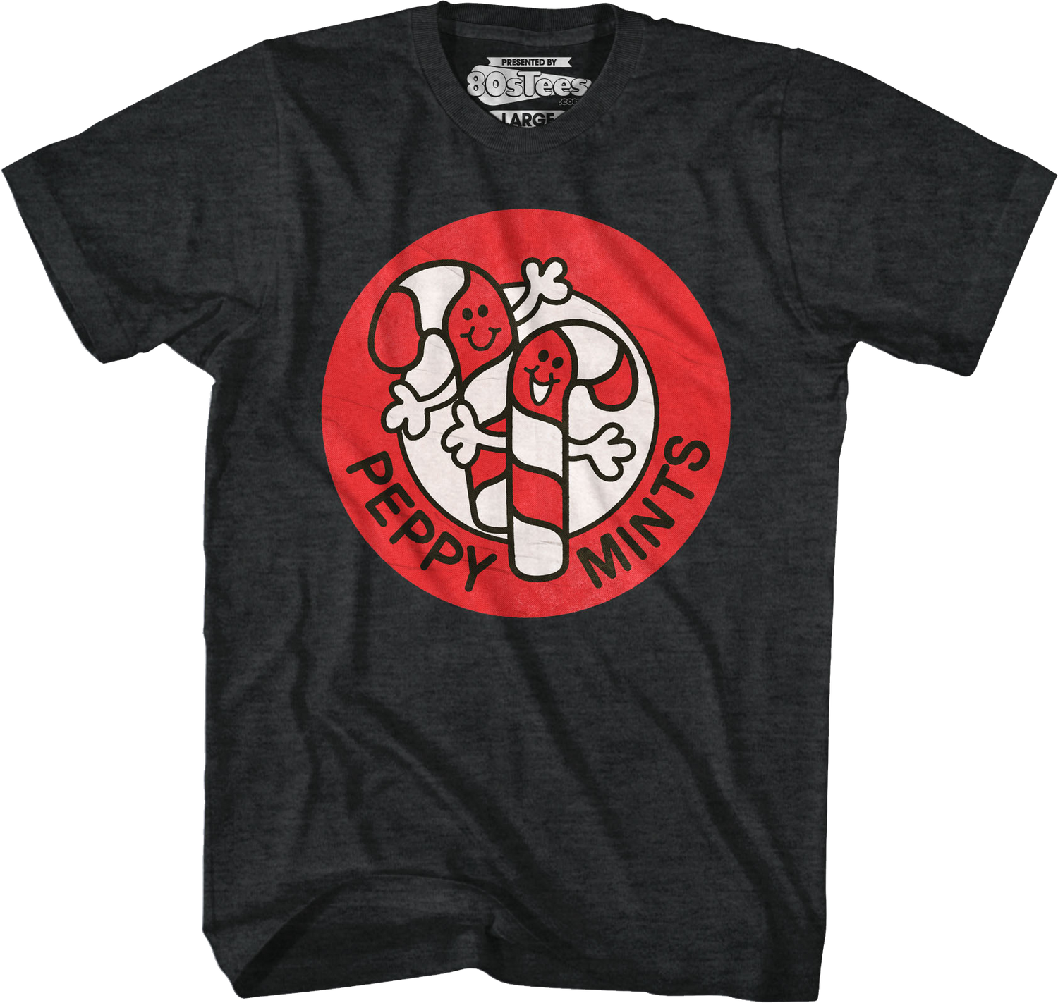 This 80sTees.com exclusive t-shirt features candy canes on a sticker that reads "Peppy Mints."
