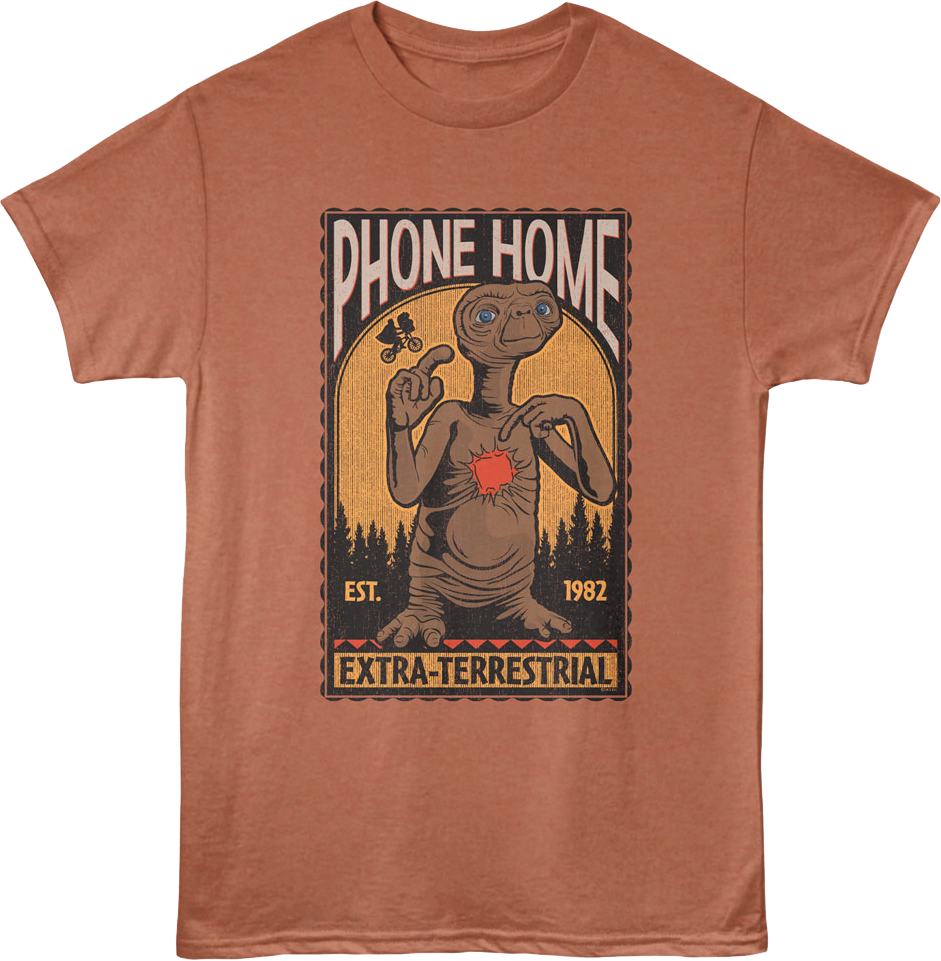 E.T. is regarded as one of the greatest movies in cinematic history, and everyone will immediately know you are a fan of Steven Spielberg's classic when you wear this Phone Home 1982 E.T. The Extra-Terrestrial T-Shirt!