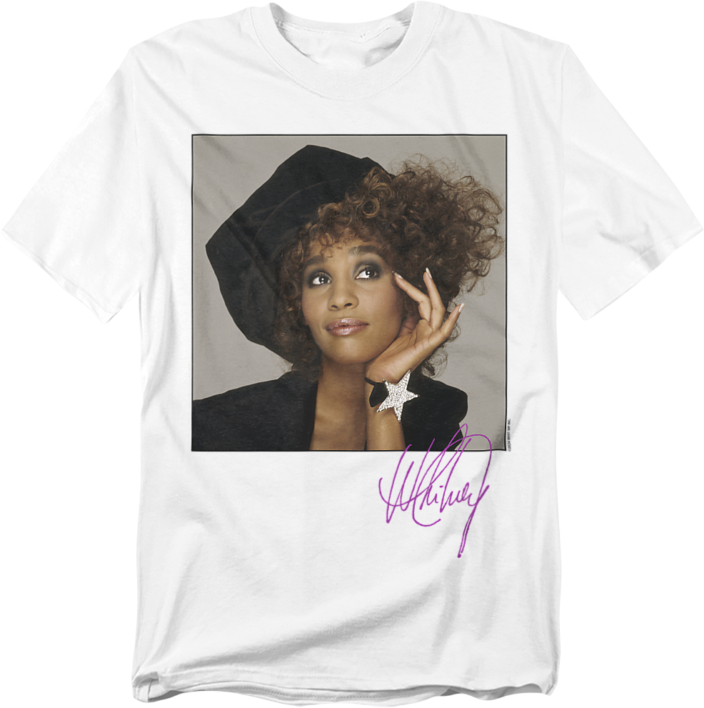 Whitney Houston is regarded as one of the greatest singers of all time because she had the ability to convey pure, raw emotion through her vocals while singing with flawless technique. Houston's hit songs include "I Will Always Love You," "I Wanna Dance With Somebody (Who Loves Me)," "How Will I Know," "Greatest Love Of All," "I Have Nothing," "Saving All My Love For You" and "Run To You." Everyone will instantly know you are a fan of the legendary singer when you wear this Photo & Autograph Whitney Houston T-Shirt!