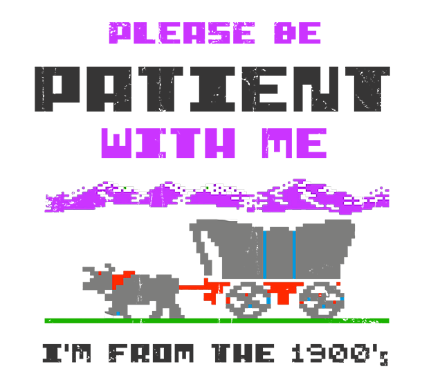 This 80sTees.com exclusive 3"x3" sticker shows a Conestoga wagon arriving at a fort in the Oregon Trail video game. The sticker reads Please Be Patient With Me I'm From The 1900's.