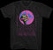 This Killer Klowns From Outer Space t-shirt shows a Popcorn Clown popping up in front of a full moon. The moon and the clown are highlighted in neon colors.