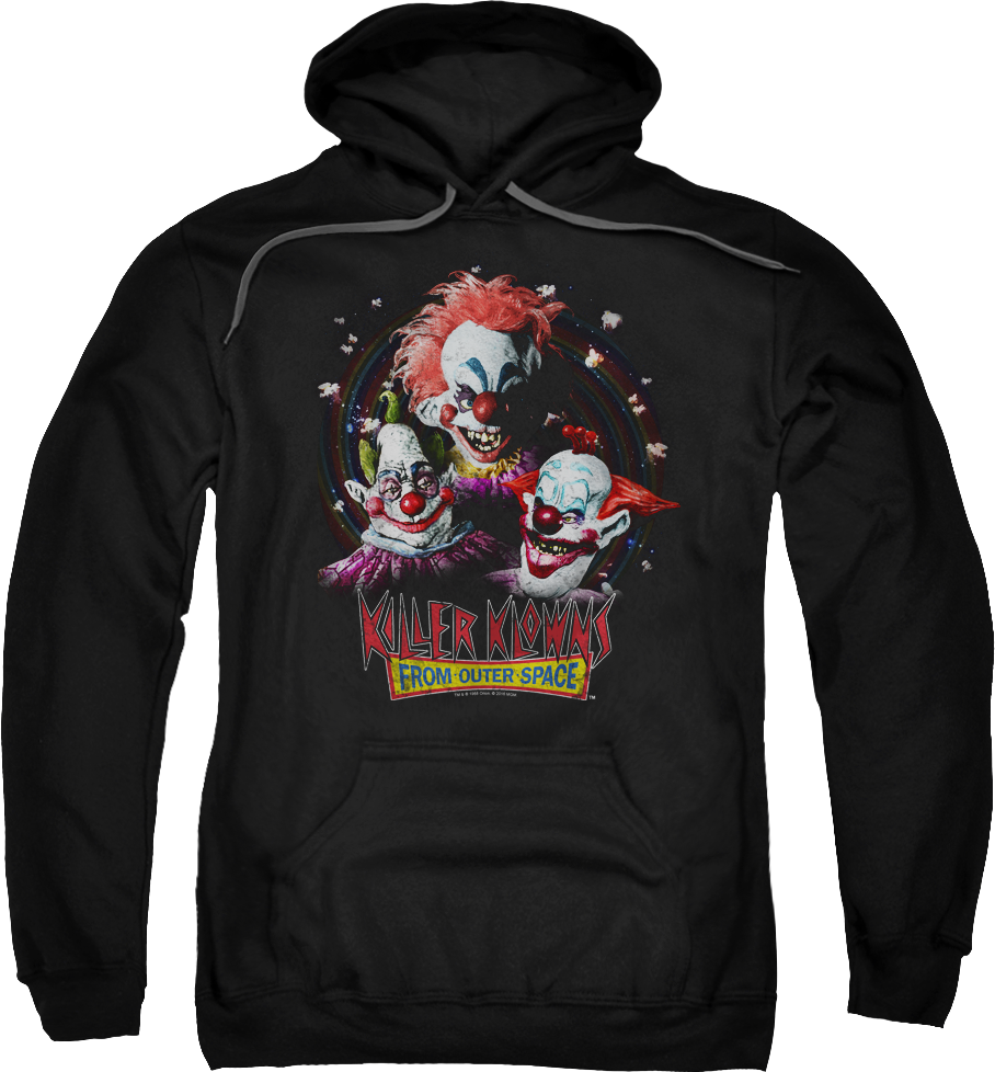 This Killer Klowns From Outer Space hoodie features the evil aliens Jumbo, Magori and Slim surrounded by one of their favorite weapons, popcorn.