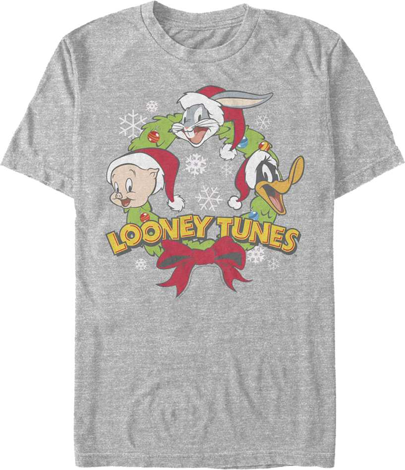 Looney Tunes shorts premiered in 1930, and is still considered one of the most popular and influential animated series of all time. That is thanks in large part to the classic characters Porky Pig, Bugs Bunny, and Daffy Duck. Let everyone know you are a fan when you wear this Porky Bugs Daffy Christmas Wreath Looney Tunes T-Shirt!