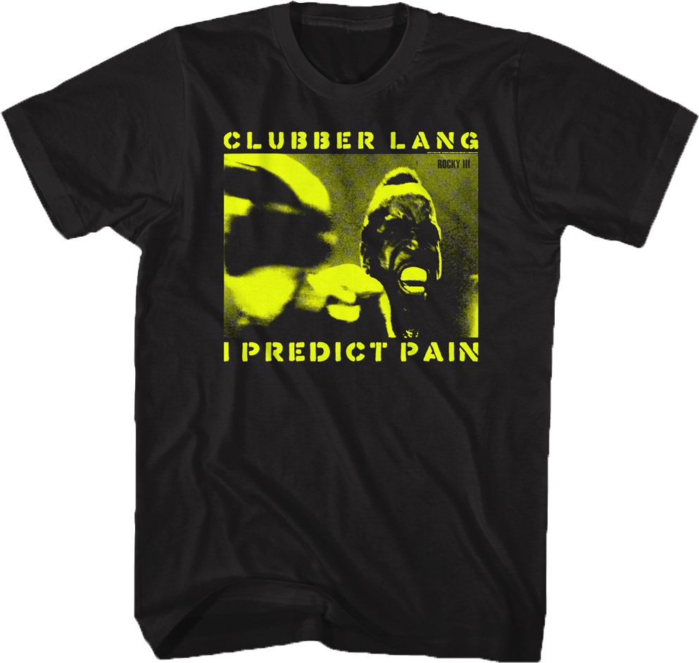This Rocky t-shirt features an image of Mr. T as Clubber Lang throwing a punch. Above the image, the shirt reads Clubber Lang. Below the image, the shirt reads I Predict Pain.