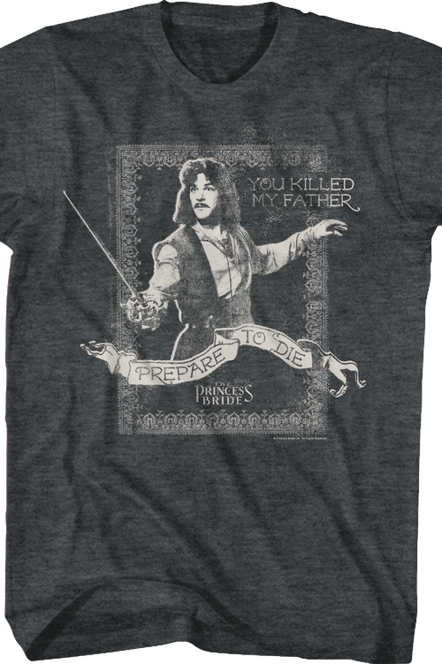 This Princess Bride t-shirt features an image of Inigo Montoya in a royal frame. The shirt reads You Killed My Father, and Prepare To Die in on a banner.