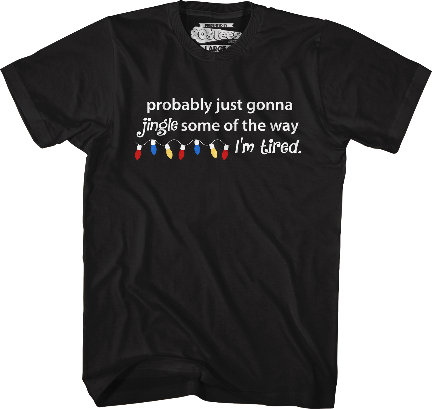 This 80sTees.com exclusive t-shirt shows Christmas lights, and reads "probably just gonna jingle some of the way i'm tired."