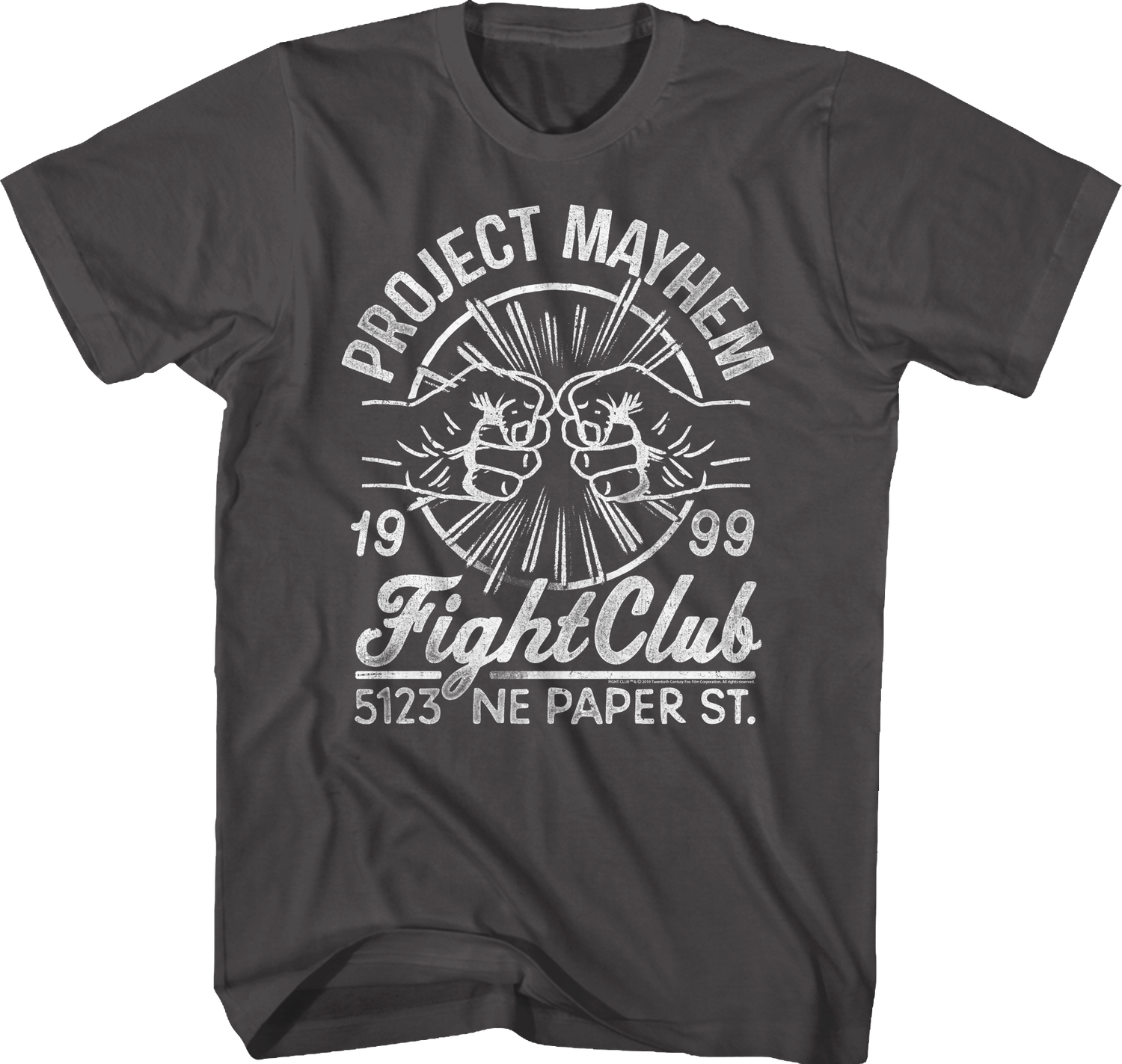 This Project Mayhem 1999 Fight Club T-Shirt shows two fists and the address for the Paper Street Soap Company. Tyler Durden's all-natural, handmade soap funded the project to take down corporate America. His space monkeys performed elaborate pranks with the end goal of taking down modern civilization.