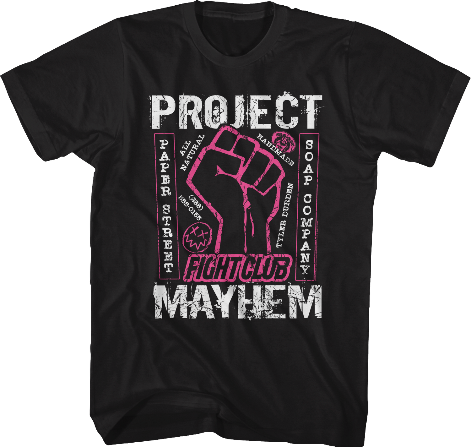 This Project Mayhem Fight Club T-Shirt shows a raised fist and the name of the Paper Street Soap Company. Tyler Durden's all-natural, handmade soap funded the project to take down corporate America. His space monkeys performed elaborate pranks with the end goal of taking down modern civilization.