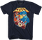 This t-shirt shows three instantly recognizable characters from the Mega Man video game series, Proto Man, Rush and Mega Man.