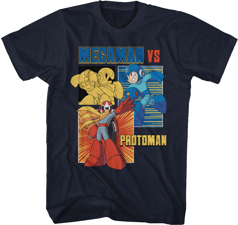 Mega Man is one of the most popular and influential video game series of all time. Everyone will immediately know you are a fan when you wear this Proto Man vs. Mega Man T-Shirt!