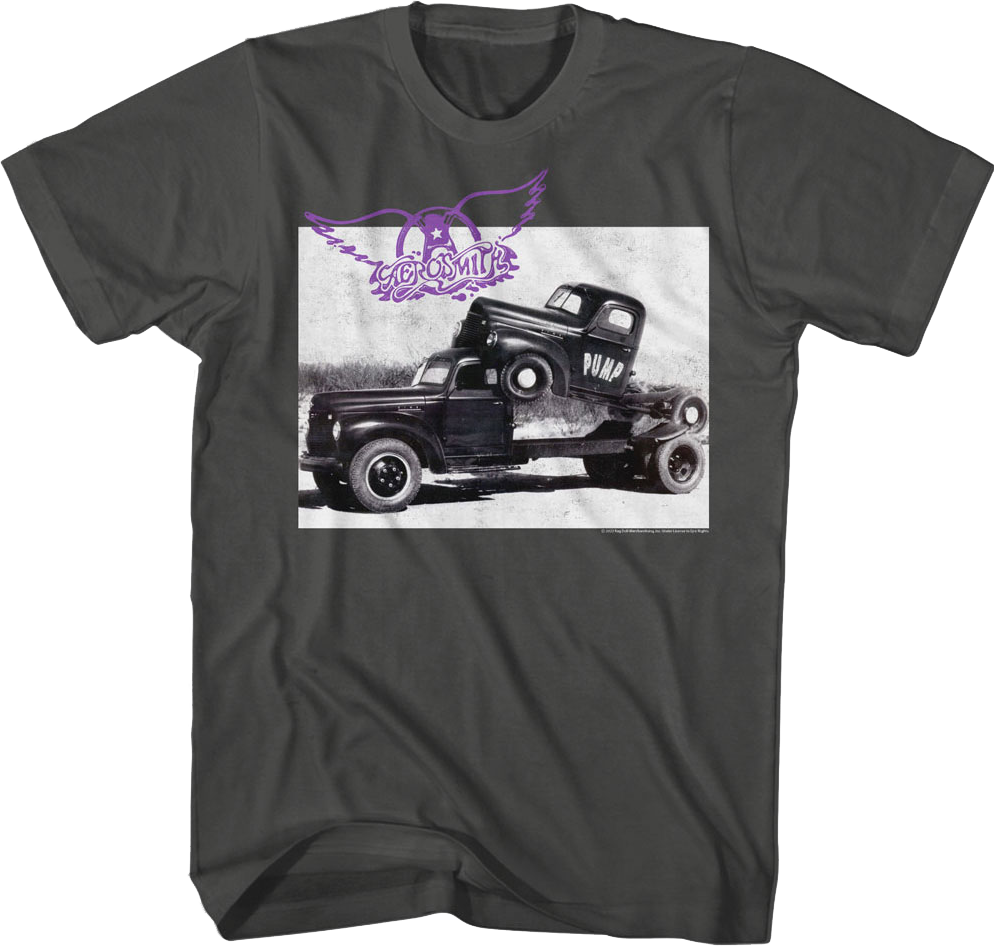 This Aerosmith t-shirt features the cover artwork for Pump, which shows a black and white photo of a smaller International K Series truck on top of a larger International KB Series truck.