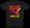 This AC/DC shirt shows band members Stevie Young, Phil Rudd, Brian Johnson, Cliff Williams, and Angus Young performing under the red AC/DC neon sign that appeared on the cover artwork for the band's seventeenth album, Power Up.