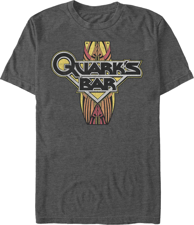 Quark's bar is open 26 hours a day and is one of the major social locations on DS9 with food and drink, including a buffet, gambling and holosuites. Staff members include Quark, Chram, Rom, Leeta, Treir, Hetik, Broik, and Frool. Let everyone know you are a fan when you wear this Quark's Bar Star Trek T-Shirt!