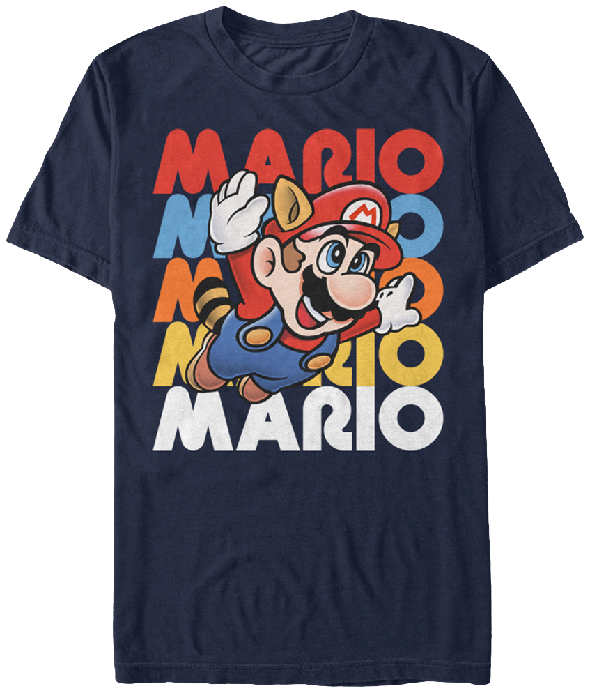 The popularity of Mario soared to new heights with introduction of Raccoon Mario in Super Mario Bros. 3. This Raccoon Mario t-shirt features an image of Raccoon Mario flying in front of a retro, color-changing repeated line of the name Mario. Gamers will remember that Raccoon Mario could fly high, slowly float down, and spin to attack enemies with his tail. Gamers will also see that you are a fan of Super Mario Bros. 3 when they see you wearing this Raccoon Mario t-shirt. Hurry! Hurry! Get your Raccoon Mario t-shirt while you still can! Fun fact: Before being released to the public, the video game Super Mario Bros. 3 appeared in the movie The Wizard.