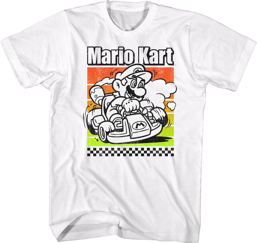 This Super Mario Bros. t-shirt shows Mario in his metal pipe frame go cart, ready to defeat all other racers on the race track in Mario Kart.