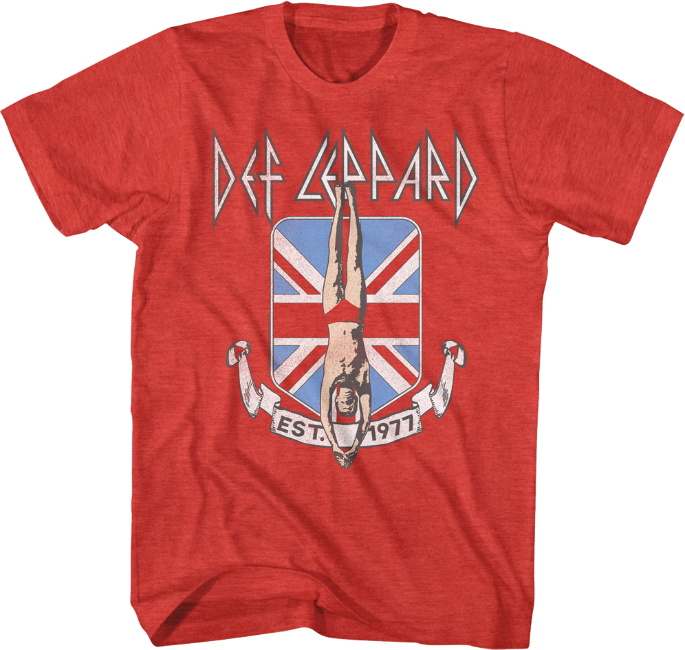 This Def Leppard t-shirt shows the diver from the cover artwork for the album High 'n' Dry positioned in front of the Union Jack flag. The shirt includes a banner that reads Est. 1977.