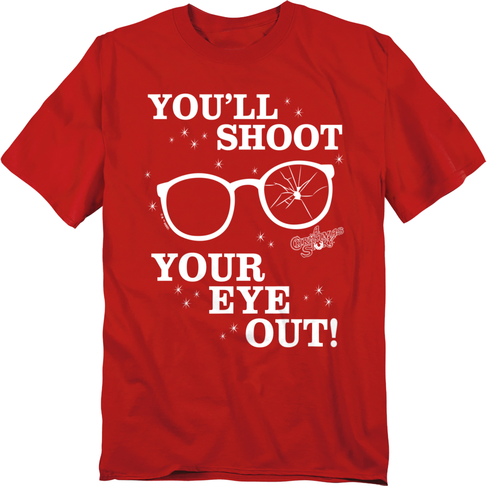 Everyone will immediately know you are a fan of the 1983 holiday classic starring Peter Billingsley when you wear this Red You'll Shoot Your Eye Out Christmas Story T-Shirt!