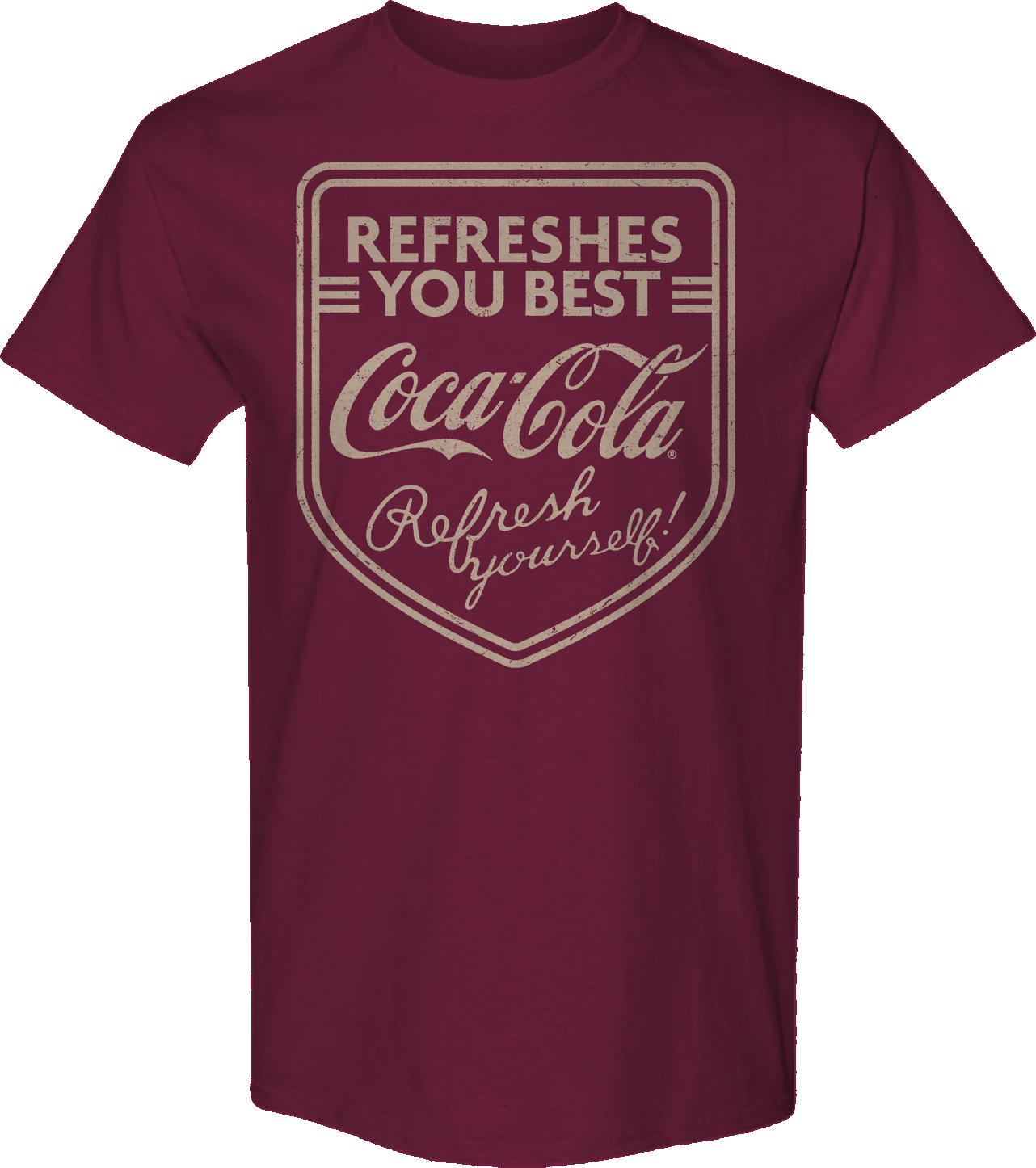 This Coca-Cola t-shirt features a shield that includes the Coca-Cola logo, and reads "Refreshes You Best" and "Refresh Yourself!"