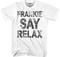 The front of this Frankie Goes To Hollywood shirt reads Frankie Say Relax. The back of the shirt reads Don't Do It. This shirt is inspired by the hit Frankie Goes To Hollywood song "Relax", which includes the lyrics "Relax, don't do it/When you want to go to it/Relax, don't do it/When you want to come".