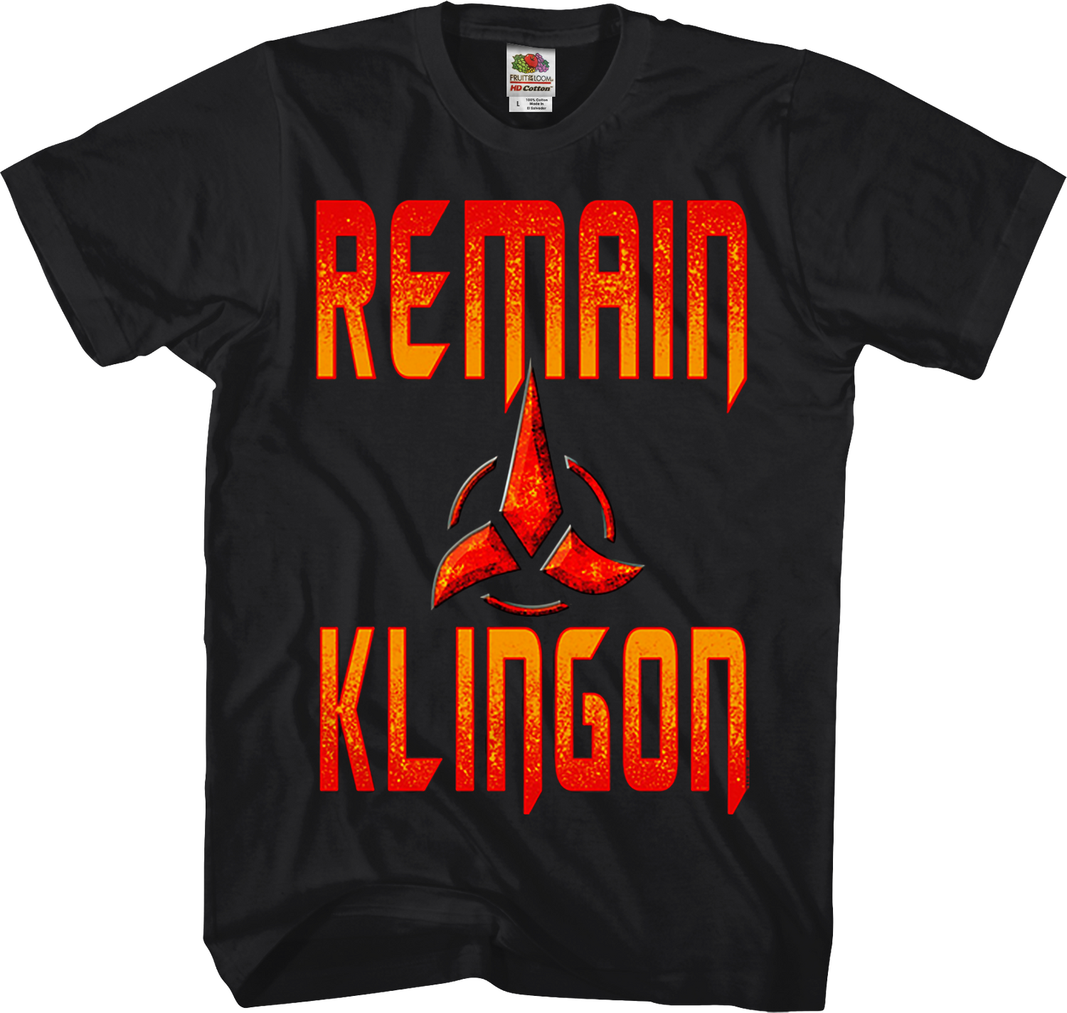 For any fan of the Klingons, this Remain Klingon Star Trek T-Shirt is a must have, or as they say in Klingon, vay' fan tlhInganpu', ratlh tlhIngan Hov trek yIvbeH SeQHa' ghob'e'.