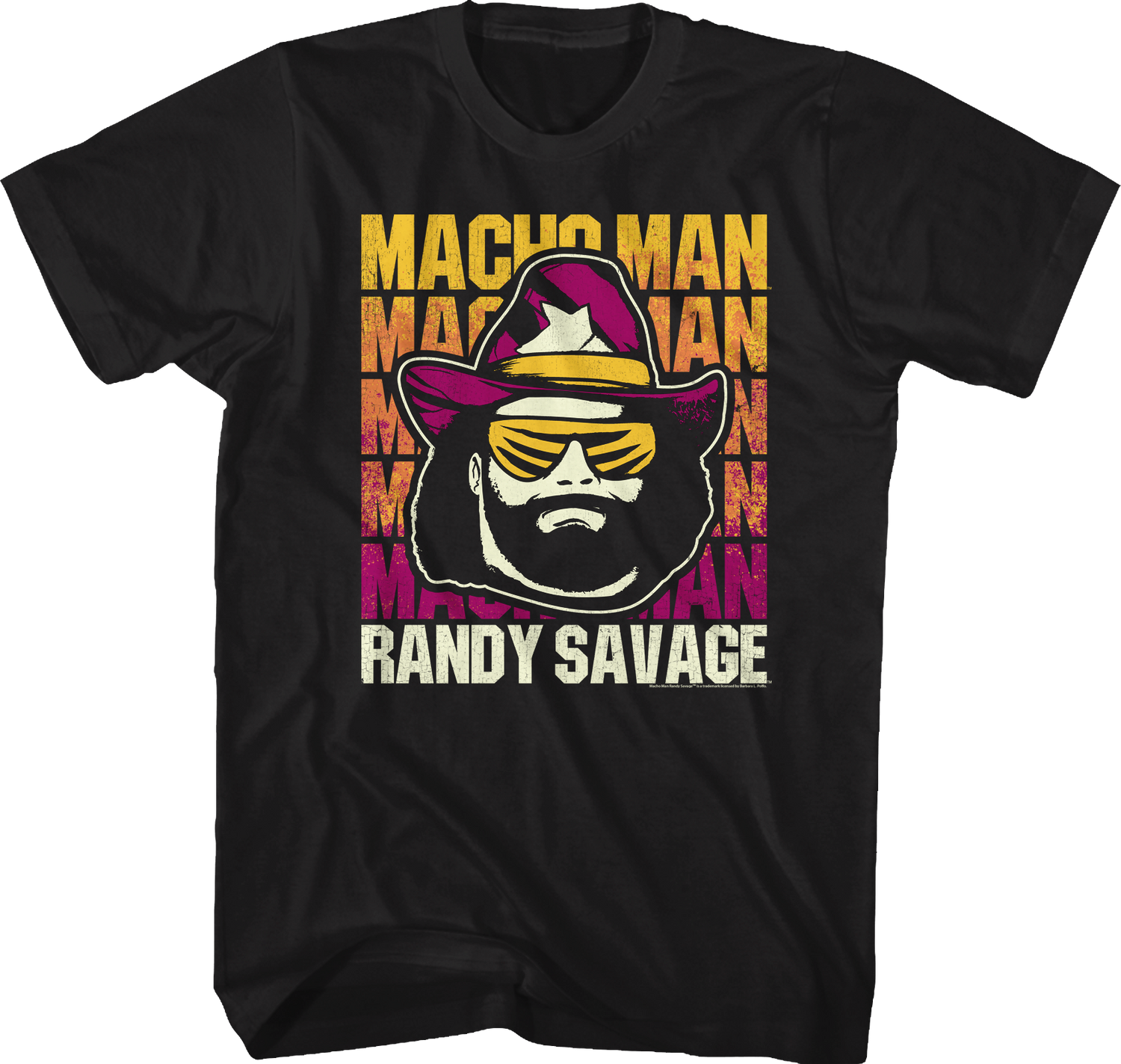 This "Macho Man" Randy Savage t-shirt shows the wrestling legend wearing his trademark cowboy hat and sunglasses.
