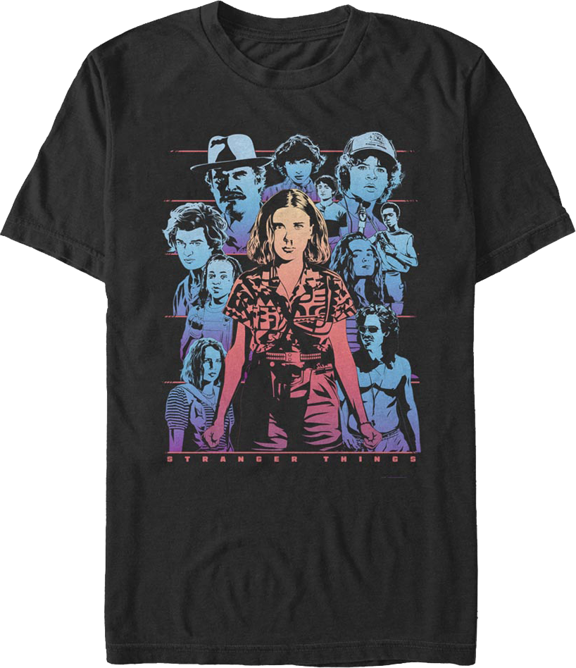 This Stranger Things t-shirt features a retro collage of the popular characters Eleven, Robin, Erica, Steve, Hopper, Mike, Will, Dustin, Lucas, Max, and Billy.