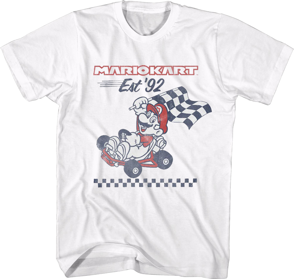 This Super Mario Bros. t-shirt shows Mario waving a checkered flag in his racing kart.