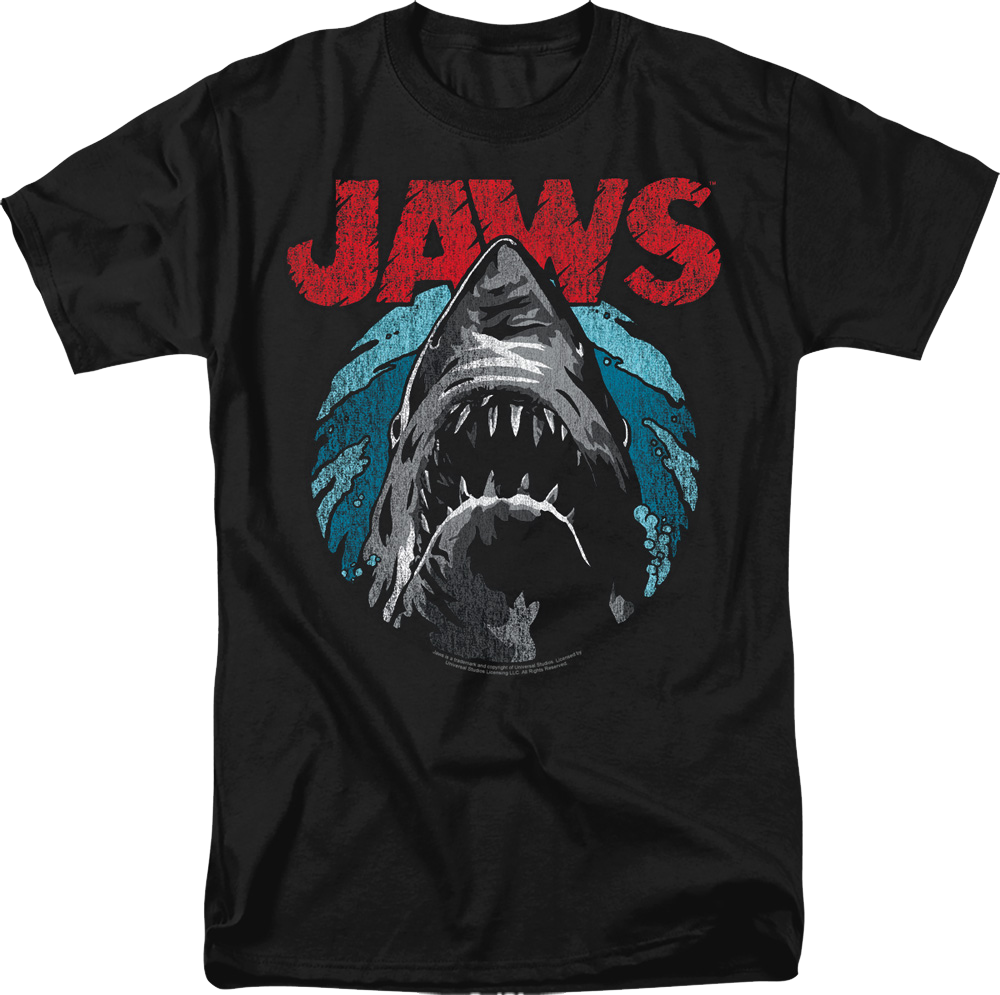 In Jaws, a rogue shark attacked several swimmers in the waters of Amity Island. It was up to Chief Brody, Matt Hooper and Quint to find and destroy the shark before it could strike again. Let everyone know you are a fan of Steven Spielberg's terrifying 1975 classic with this Retro Shark Attack Jaws T-Shirt!
