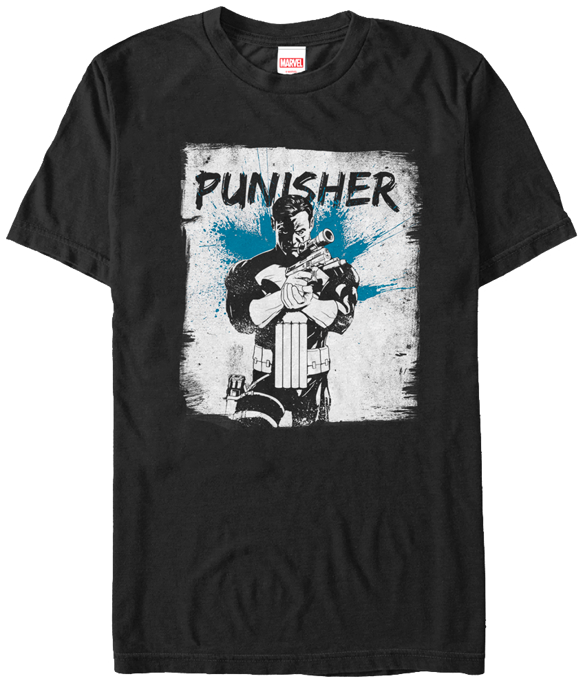 This Punisher t-shirt features the cover artwork for Rick Remender's Punisher mega-arc Omnibus with splattered blue paint in the background.