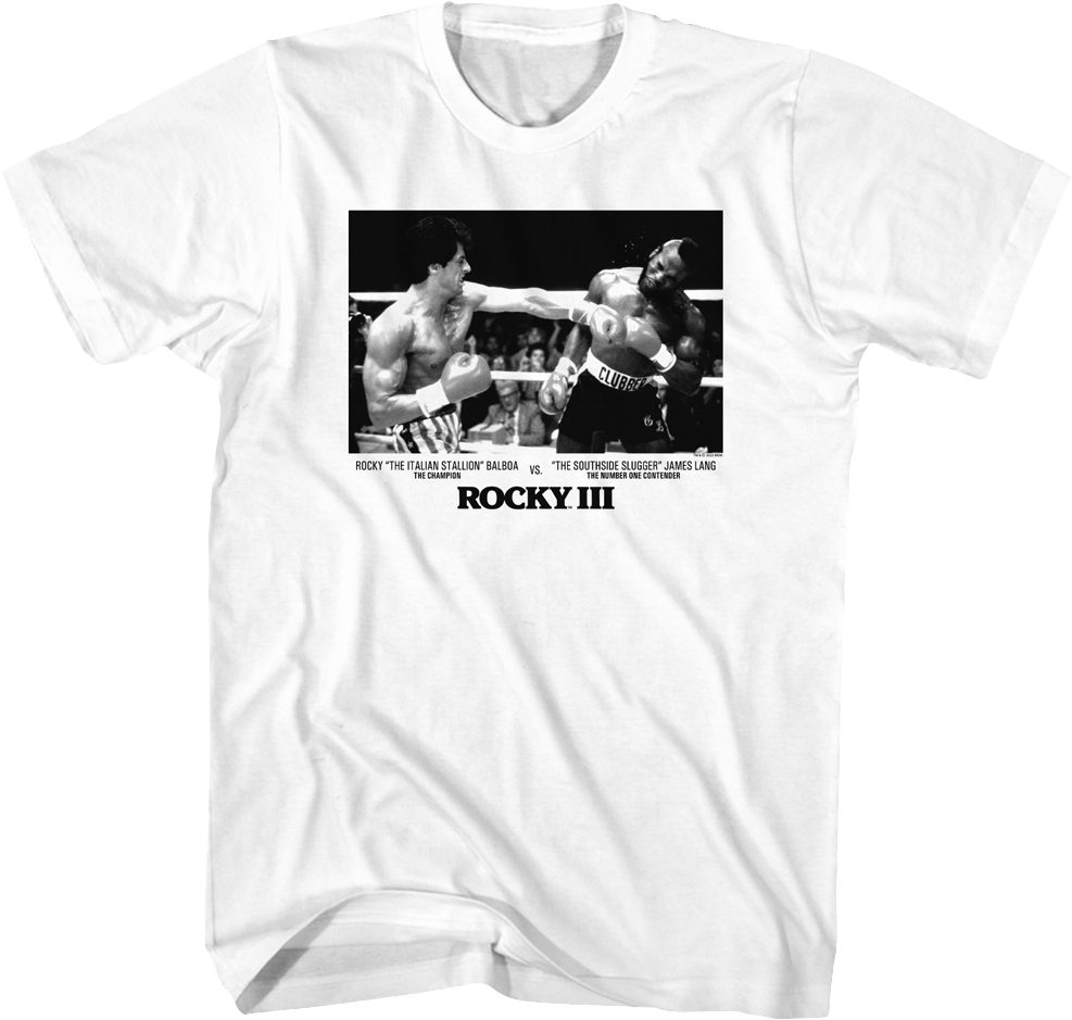 For any fan of the classic 1982 sequel starring Sylvester Stallone and Mr. T, this Rocky Balboa vs. Clubber Lang Black And White Photo Rocky III T-Shirt is a must have!