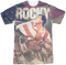 This sublimation Rocky shirt shows Sylvester Stallone as the Italian Stallion draped in an American flag from the poster artwork for the 1985 movie Rocky IV. Rocky Balboa is being embraced by Duke and Paulie. The back of the shirt shows an American flag and the Rocky logo. This is the perfect Rocky shirt to cover your burning heart. You'll hear cheers from the unsilent majority of Rocky fans. You may even hear the occasional "I Must Break You". Show your love for Rocky IV with this sublimation t-shirt.