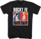 This Rocky t-shirt shows Rocky Balboa and Ivan Drago ready to fight in an old school video game. The shirt includes images of Rocky and Drago touching gloves, and each character is positioned in front of their country's flag. Attribute levels show Rocky and Drago's levels for Power, Speed, Reach, and Guts.