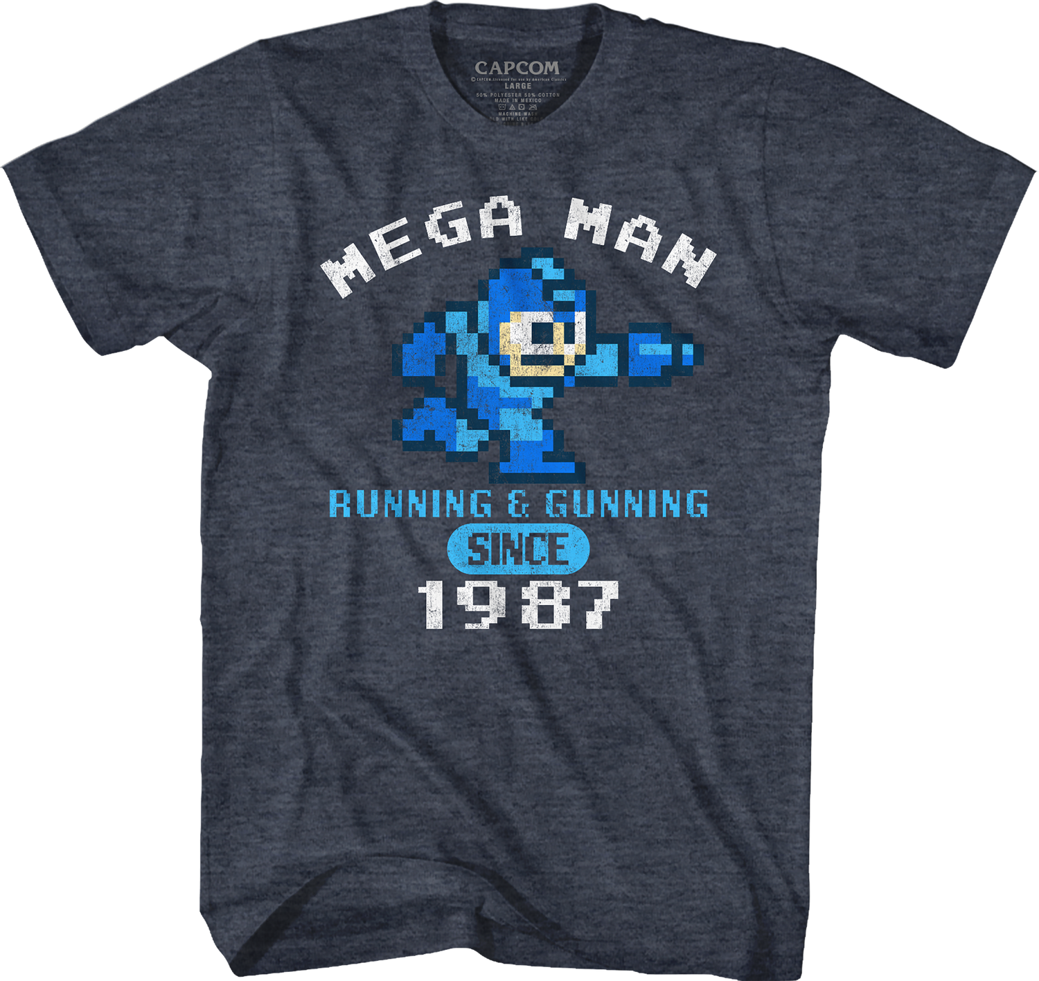 This Mega Man t-shirt features an image of the Capcom superstar running and ready to fire his Mega Buster. The shirt reads Running & Gunning Since 1987.