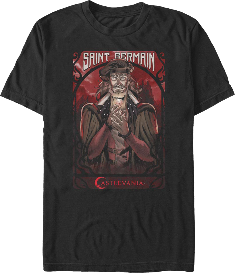 Saint Germain is a mysterious time traveler who seems to have infinite knowledge. He tends to keep his true motives a mystery. Let everyone know you are a fan of the character that was first seen in the Garibaldi Temple when you wear this Saint Germain Castlevania T-Shirt!