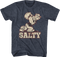 This Salty Popeye T-Shirt features an image of the sailor man with his his pipe, tattoos, and sailor uniform. The shirt reads "salty". Popeye debuted in a comic strip in 1929. Since then, he has appeared in comic books, cartoons, video games and movies, and has become one of the most popular cartoon characters of all time. In every one of his cartoon episodes, Popeye has proven that he has the spunky attitude to save the day.