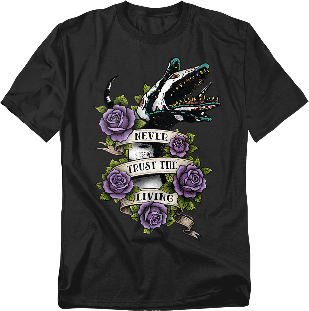 This Beetlejuice t-shirt features a Sandworm surrounded by flowers and a banner that reads "Never Trust The Living."
