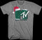 This MTV shirt shows a snow-covered tree shaped like the iconic MTV logo. The logo is wearing a festive Santa Claus hat.