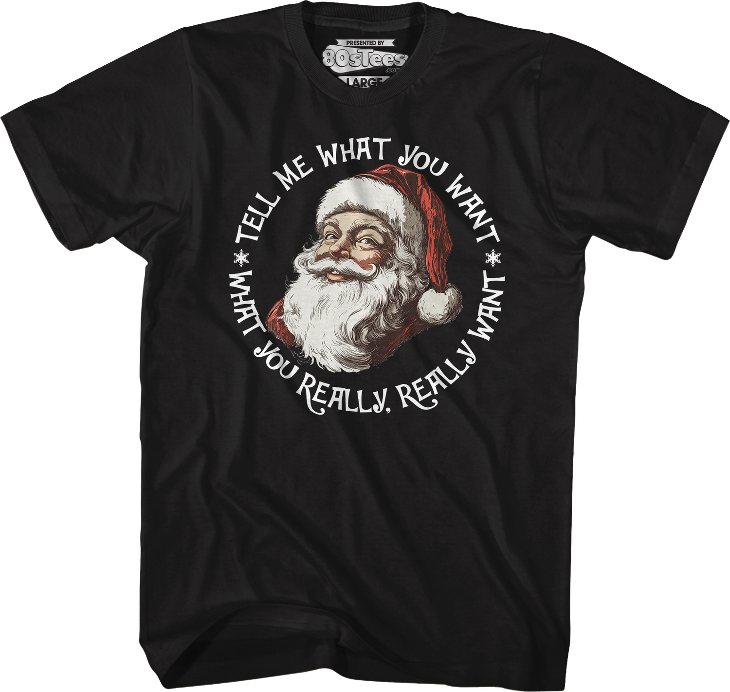 This 80sTees.com exclusive t-shirt features an image of Santa Claus. The shirt includes the Spice Girls lyrics "Tell me what you want, what you really, really want."