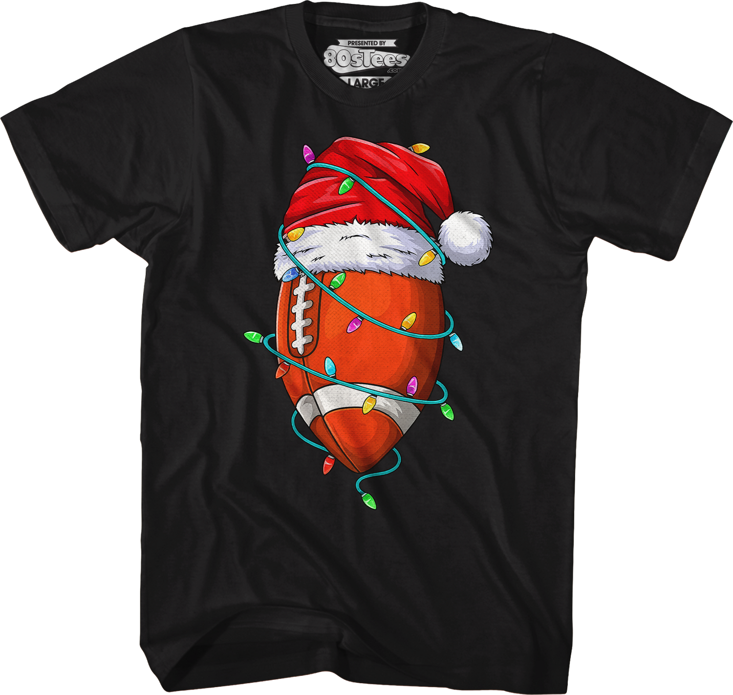 This 80sTees.com exclusive t-shirt shows a football decorated with a Santa Claus hat and Christmas lights.
