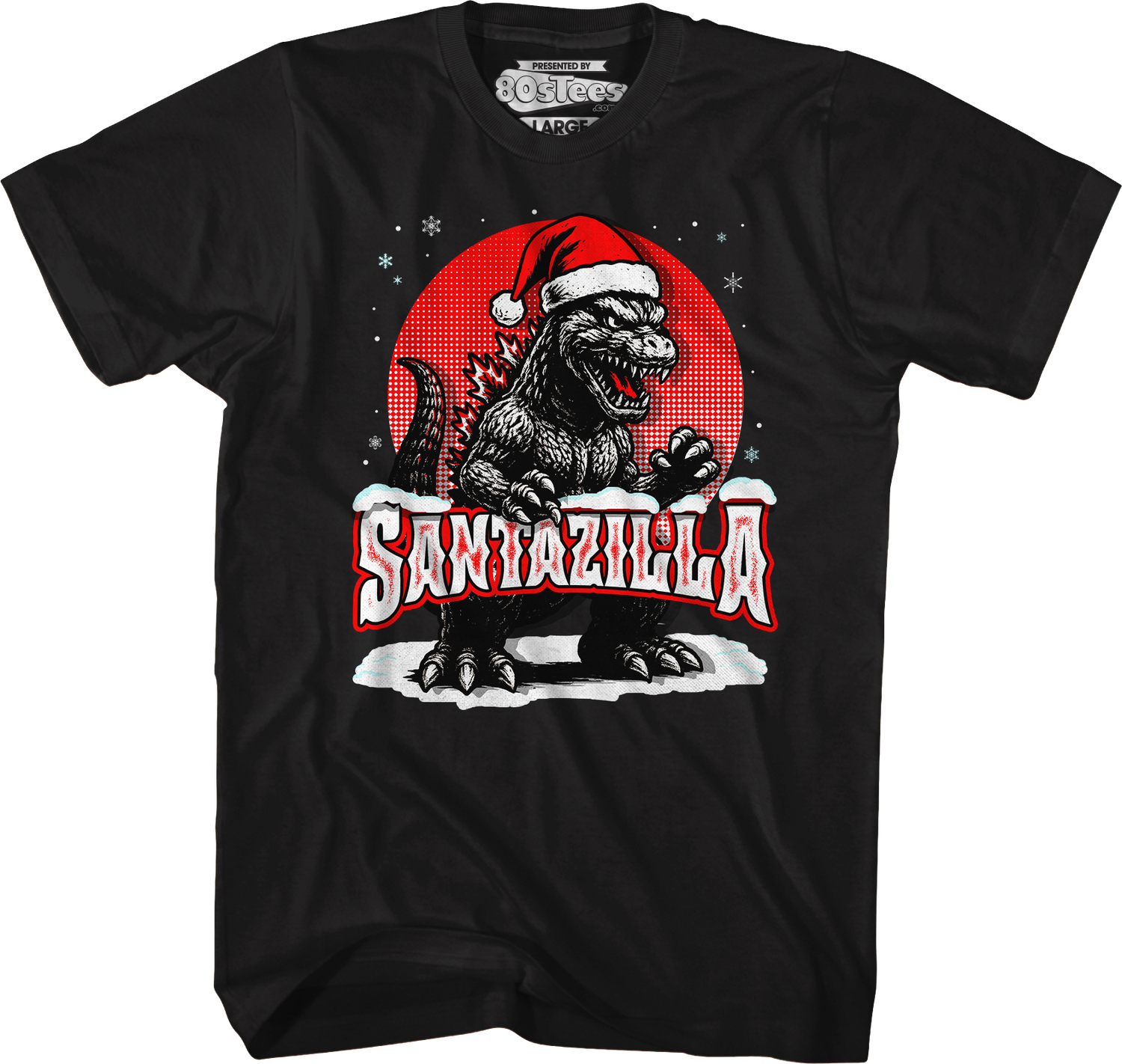 This 80sTees.com exclusive t-shirt features an image of Godzilla wearing a Santa Claus hat. The shirt reads Santazilla.