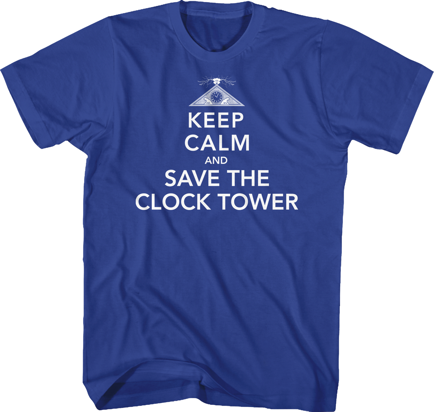 This Save The Clock Tower shirt reimagines the Hill Valley Preservation Society's attempt to prevent the replacement of the courthouse clock tower as a British propaganda poster.