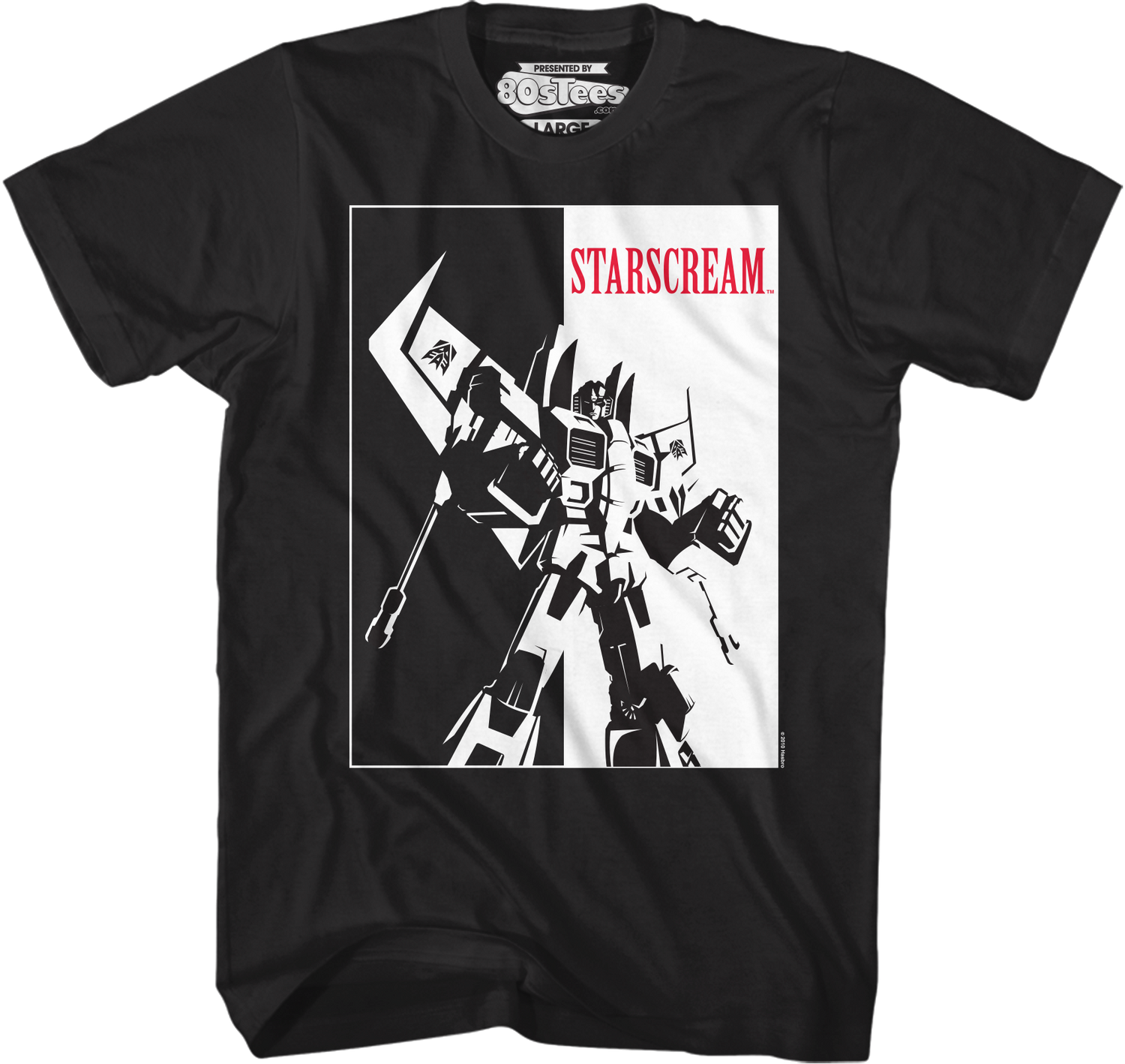 This Starscream Transformers Shirt features the Decepticon on a graphic similar to the famous black and white Scarface poster.
