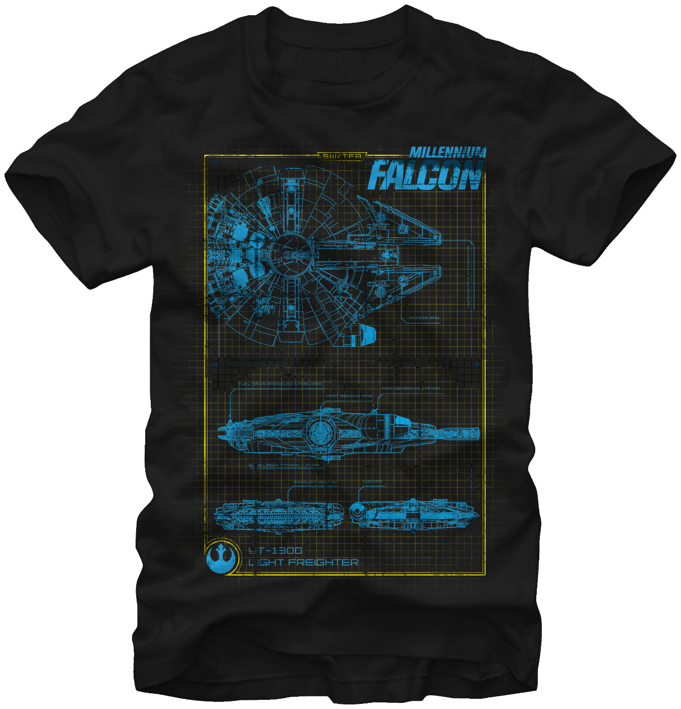This Star Wars t-shirt features schematic diagrams of the YT-1300f light freighter known as the Millennium Falcon.