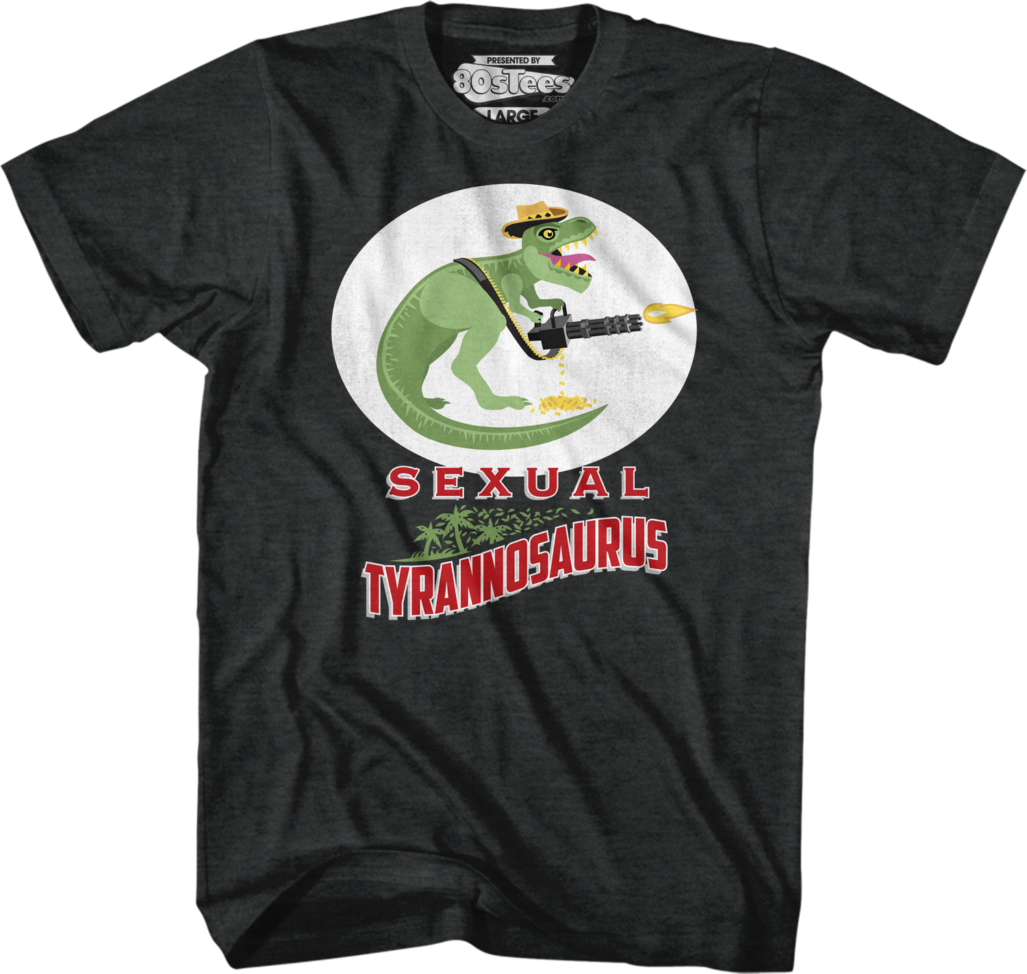 This 80sTees.com exclusive Predator t-shirt shows what the logo for Sexual Tyrannosaurus chewing tobacco might look like. The logo shows a Tyrannosaurus Rex dressed as Blain Cooper and shooting a complete with a M134 Minigun.