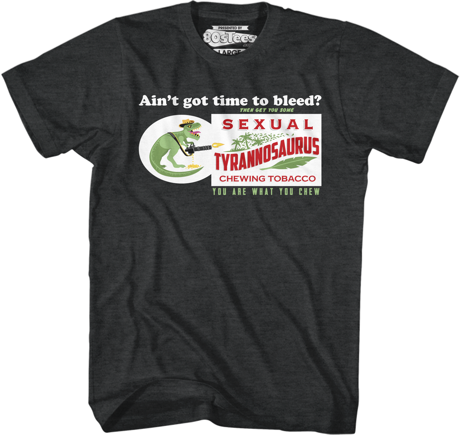 Some men just ain't got time to bleed. They ain't slack-jawed because they are chewing on Sexual Tyrannosaurus tobacco. This was the preferred chewing tobacco of Blain Cooper in the 1987 sci-fi thriller Predator. Now, you can show everyone that You Are What You Chew with this Sexual Tyrannosaurus shirt. The shirt shows what the logo for the chewing tobacco might look like. The shirt also features a dinosaur mascot dressed up as Blain, complete with a M134 Minigun. For any fan of the Arnold Schwarzenegger movie Predator, this 80sTees.com exclusive Sexual Tyrannosaurus t-shirt is a must have.