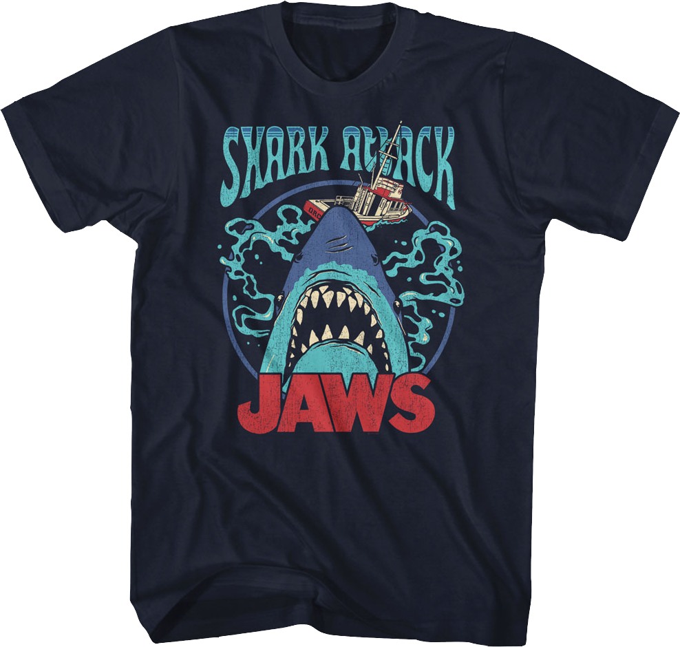 This Jaws t-shirt shows a great white shark ready to attack Quint's Orca boat.