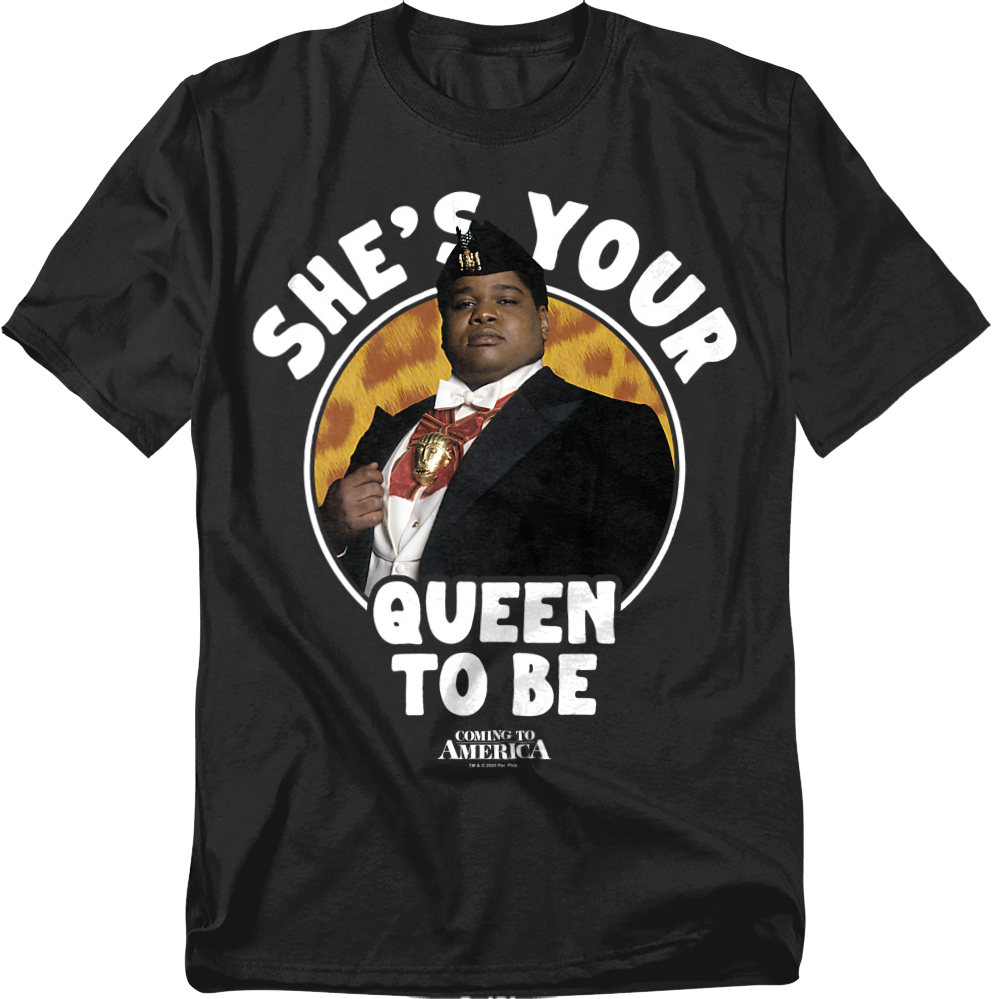 This Coming To America t-shirt features an image of Prince Akeem's royal aide Oha. The shirt reads She's Your Queen To Be.