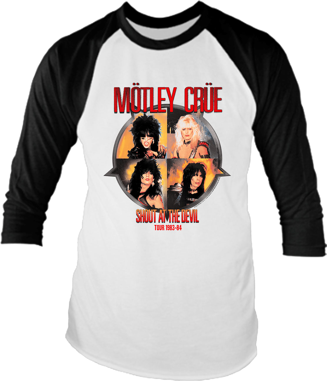 Show that you are a fan of the album that produced the classic hits "Looks That Kill", "Red Hot" and "Too Young To Fall In Love" with this Shout At The Devil Motley Crue Raglan Baseball Shirt!