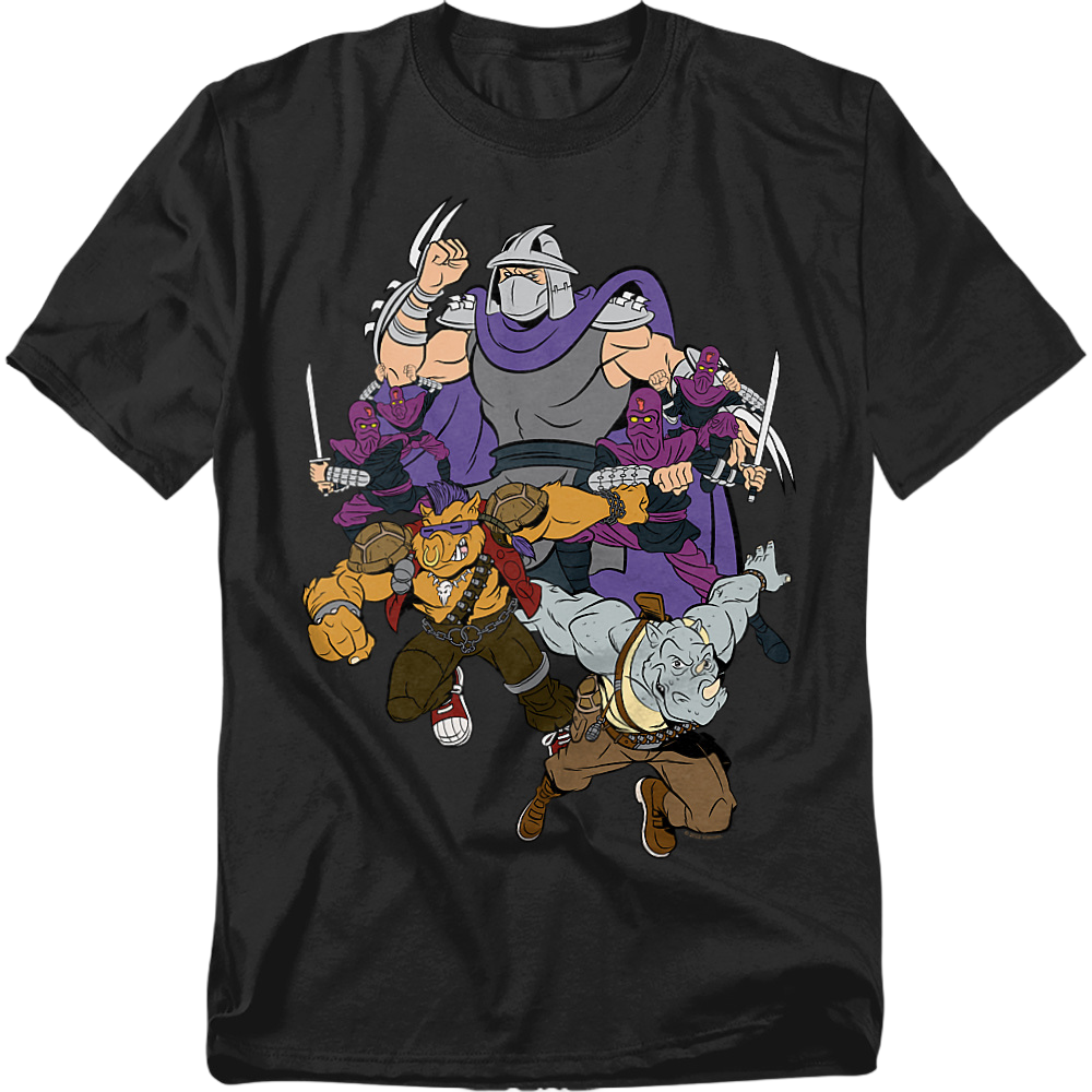 This Teenage Mutant Ninja Turtles t-shirt shows Shredder with masked Foot Clan members and the mutants Bebop and Rocksteady.