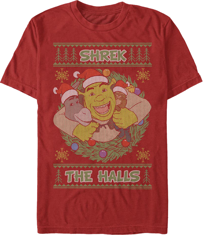 For any fan of the hilarious animated franchise starring Mike Meyers, Eddie Murphy, and Antonio Banderas, this Shrek The Halls Faux Ugly Christmas Sweater Shrek T-Shirt is a must have!
